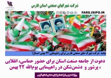 شرکت شهرک های صنعتی فارس ؛ از ملت بزرگ و آگاه و فهیم ایران اسلامی بویژه صنعتگران ،کارآفرینان و فعالان شاغل در واحدهای صنعتی  دعوت می کند تا بار دیگر با حضور حماسی، انقلابی و پرشور و دشمن‌شکن خود در صحنه نمایش حماسه حضور و وحدت ملی در آوردگاه یوم‌الله ۲۲ بهمن بار دیگر با آرمان‌های معمار کبیر انقلاب اسلامی، حضرت امام خمینی (ره) و شهدا تجدید میثاق نموده و با لبیک به دعوت مقام معظم رهبری «مد ظله العالی »ادامه دهندۀ حقیقی راه شهدا و امام شهدا باشند.