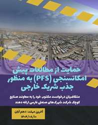 شرکت شهرکهای صنعتی فارس، در راستای توسعه همکاریهای بینالمللی و حمایت از صنایع کوچک، از انجام مطالعات پیش امکانسنجی (PFS) جهت جذب شریک خارجی حمایت میکند.